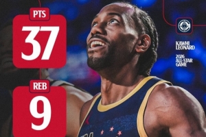 伦纳德今日总共砍下37分9篮板3助攻4抢断,配文官方晒图写道:“科怀·伦纳德在主场大放异彩🤩。”
