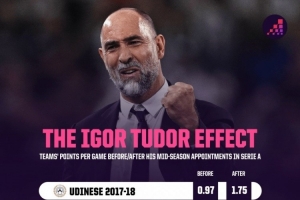 图多尔意甲赛季中途上任之前、之后球队场均积分: