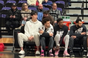 因背部拉伤缺席!杨瀚森身着便装 坐在替补席支持混音队友